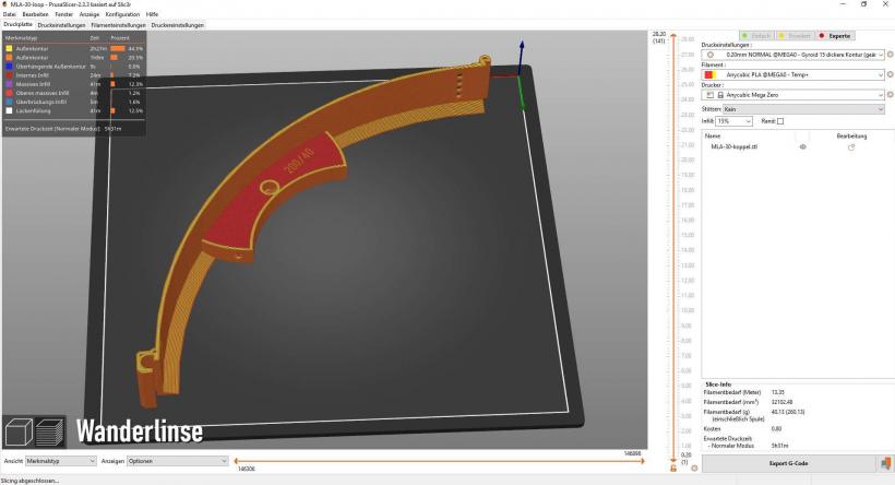 Hier siehst du die Teile im Slicer. Am längsten dauert der Fuß (Pyramide) mit ca. 14 Stunden. Die anderen Teile gehen schneller. Für die Achse musst du Support mit drucken (grün).